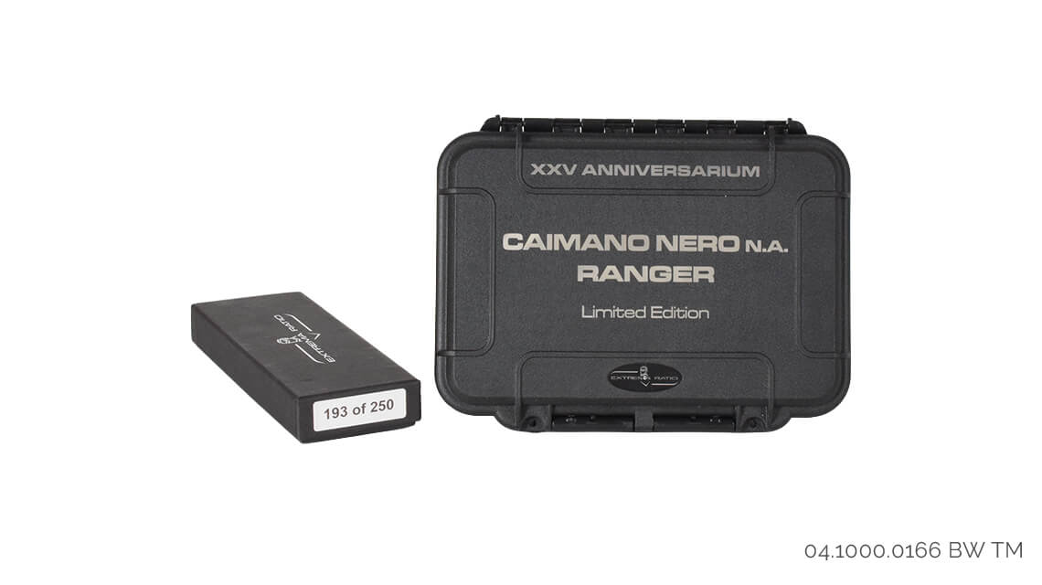 Extrema Ratio Caimano Nero N.A. Ranger 25. Yıl, Extrema Ratio'nun İtalyan Donanması G.O.I.'ye (Operasyonel Akıncılar Grubu) tedarik ettiği taktik bıçağın otomatik olmayan bir versiyonu olan ünlü Caimano Nero N.A.'nın tüm özelliklerini taşıyan sadece 250 adetlik sınırlı bir üründür.