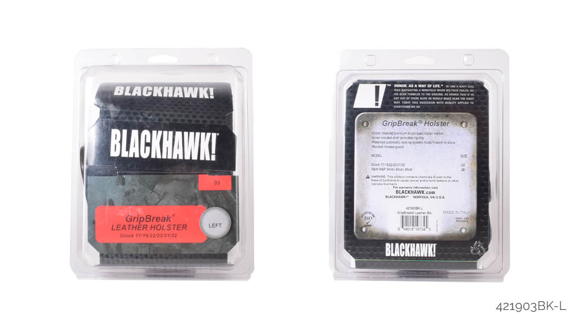 GripBreak dışı deriden üretilmiş kilitli bir kılıftır. Otomatik kilit mekanizması silahı emniyetle kılıfında tutarken, baş parmak hareketiyle basitçe kullanılan mandal, kilidi devreden çıkarır. Kılıf, hızlı ve doğru kavrama, düzgün çekiş sağlar.