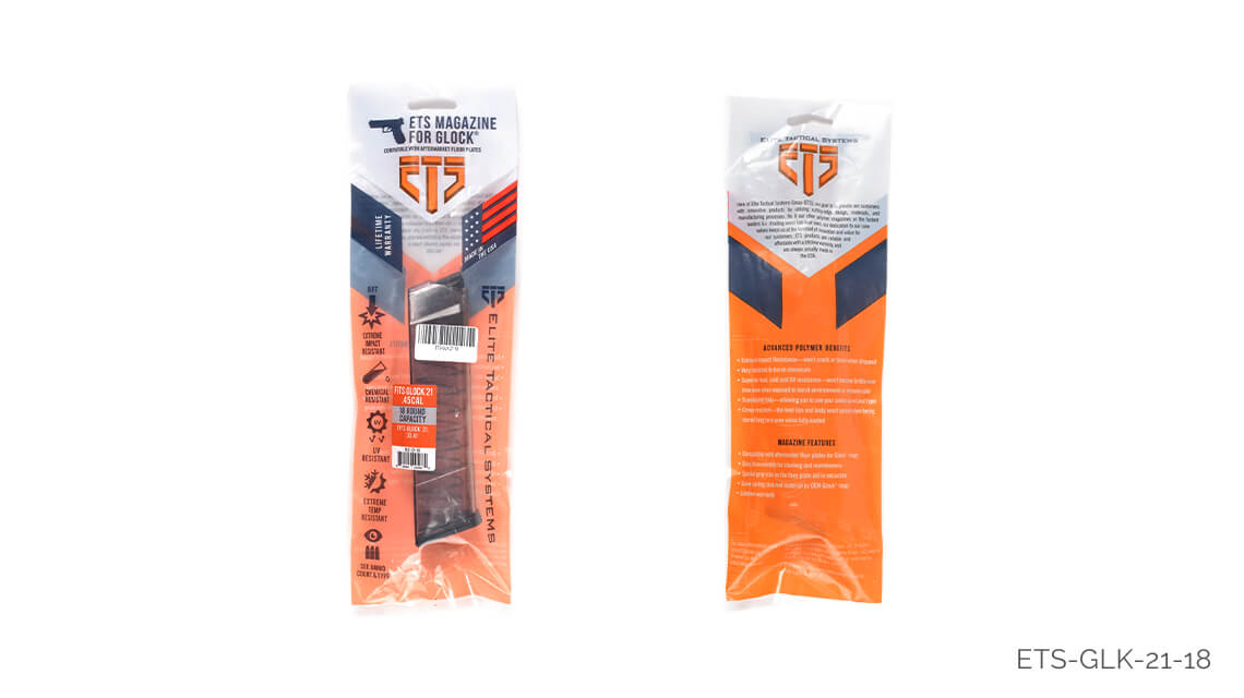 Glock 21 için 18 kapasiteli şeffaf polimer şarjör.