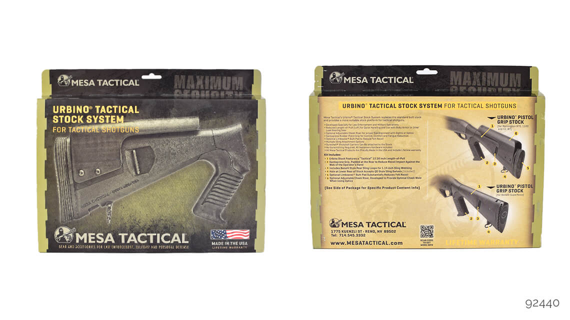 Mesa Tactical’ın Urbino tabanca tipi kabzalı dipçikleri cam elyafı ile güçlendirilmiş naylondan enjeksiyon kalıpla üretilmiştir. Bu dipçikler, Benelli taktik dipçikleri modellenerek üretilmiştir. Fakat onlardan temelde 2,5-5 cm daha kısadır. Mesa Tactical Urbino dipçikleri Benelli, Beretta, Remington ve Mossberg için üretmektedir.