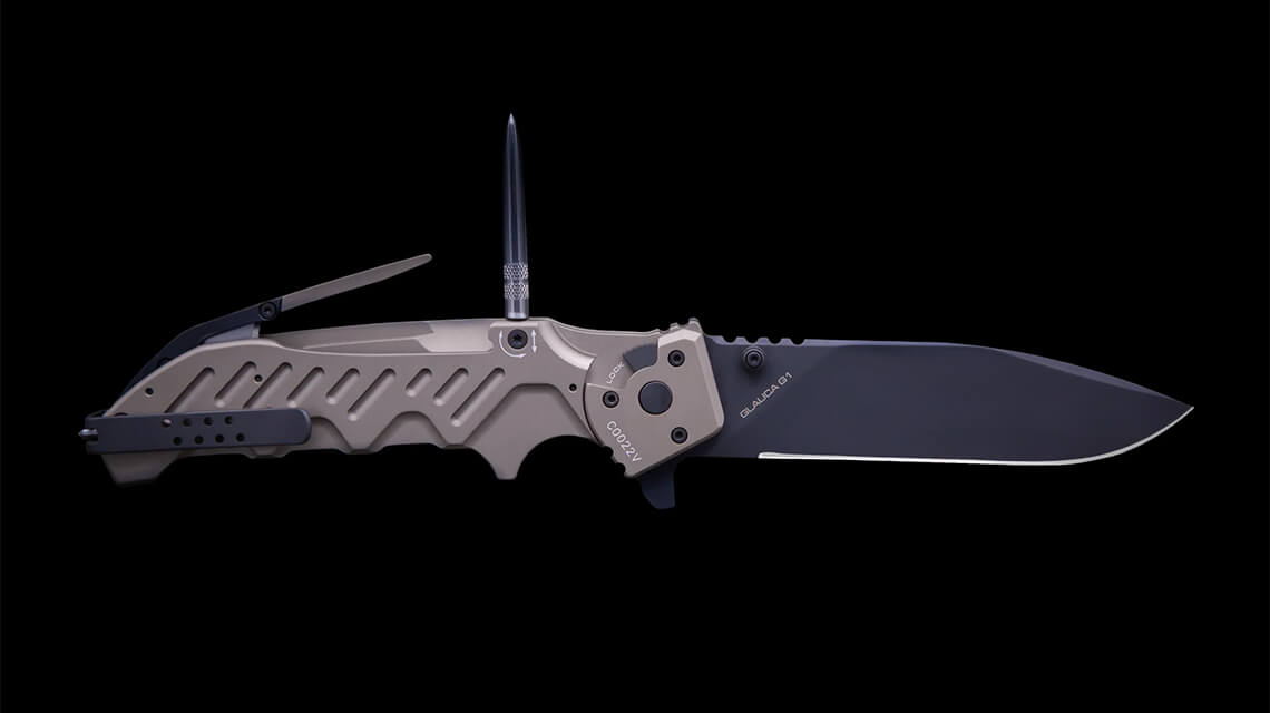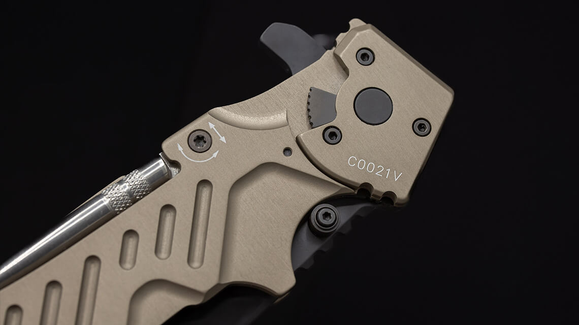 Sap, taktik kahve renginde anodize antikorodal alüminyumdan yapılmıştır. Tungsten karbür cam kırıcı ve iki farklı pozisyonda (biri önden) ayarlanabilen bir klips ile donatılmıştır. Arkada, açıldığında kilitlenebilen paslanmaz çelikten hızlı acil durum kesimi yapmasını sağlayan katlanabilir bir kurtarma aleti bulunmaktadır. Bu ikinci alet, kemer kesici olarak da mükemmeldir. Bıçak kilitleme sistemi, manuel olarak çalıştırılan ikinci bir güvenlik mekanizması ile desteklenen, zaman içinde kendini kanıtlamış LINER-LOCK sistemidir. Bıçak, 58 HRC sertliğe sahip Böhler N690 çeliğinden yapılmış olup, klasik Extrema Ratio MIL-C-13924 siyah kaplamaya sahiptir.