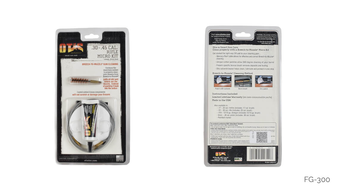 300 Mikro kiti .30 ile .45 kalibre arası tüfeklerde kullanılmak üzere tasarlanmıştır. Bu kitte, bronz uçlu 75 cm’lik Memory-Flex® kablo, 14 gramlık Otis O85® Ultra Bore® Solvent, tüm kalibrelere uygun peçler ve .35 kalibre fırça bulunur.
