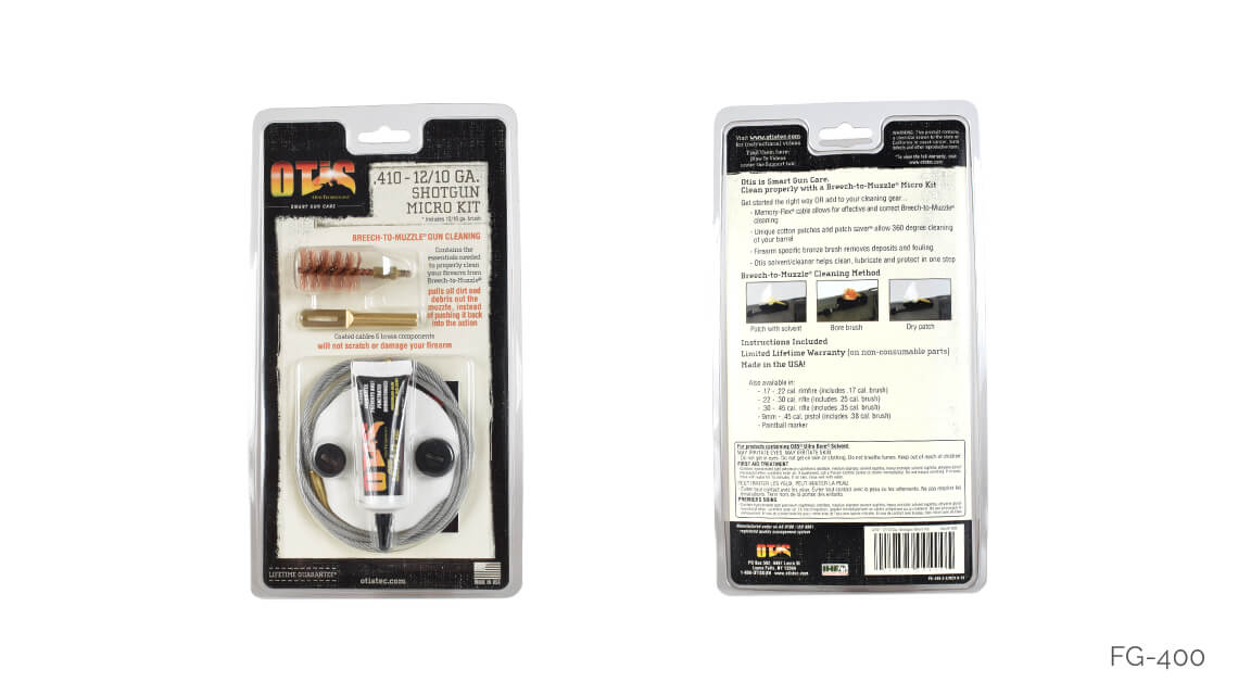 400 Mikro kiti 36 ile 12 Ga arası yivsiz tüfekleri sökmeden temizlemek üzere tasarlanmıştır. Bu kitte, içten dişli bronz uçlu 90 cm’lik Memory-Flex® kablo, 14 gramlık Otis O85® Ultra Bore® Solvent, tüm kalibrelere uygun peçler, küçük ve büyük peç aparatı (Patch Savers®) ve 12 Ga fırça bulunur.