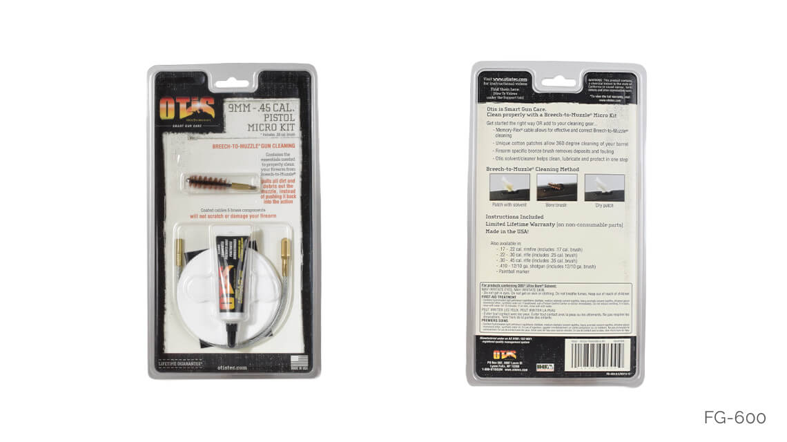 600 Mikro kiti 9 mm ile .45 kalibre arası yarı otomatik ve toplu tabancaları temizlemek üzere tasarlanmıştır. Bu kitte, bronz uçlu 20 cm’lik Memory-Flex® kablo, 14 gramlık Otis O85® Ultra Bore® Solvent, büyük kalibre panoply peçler ve .38 kalibre fırça bulunur.