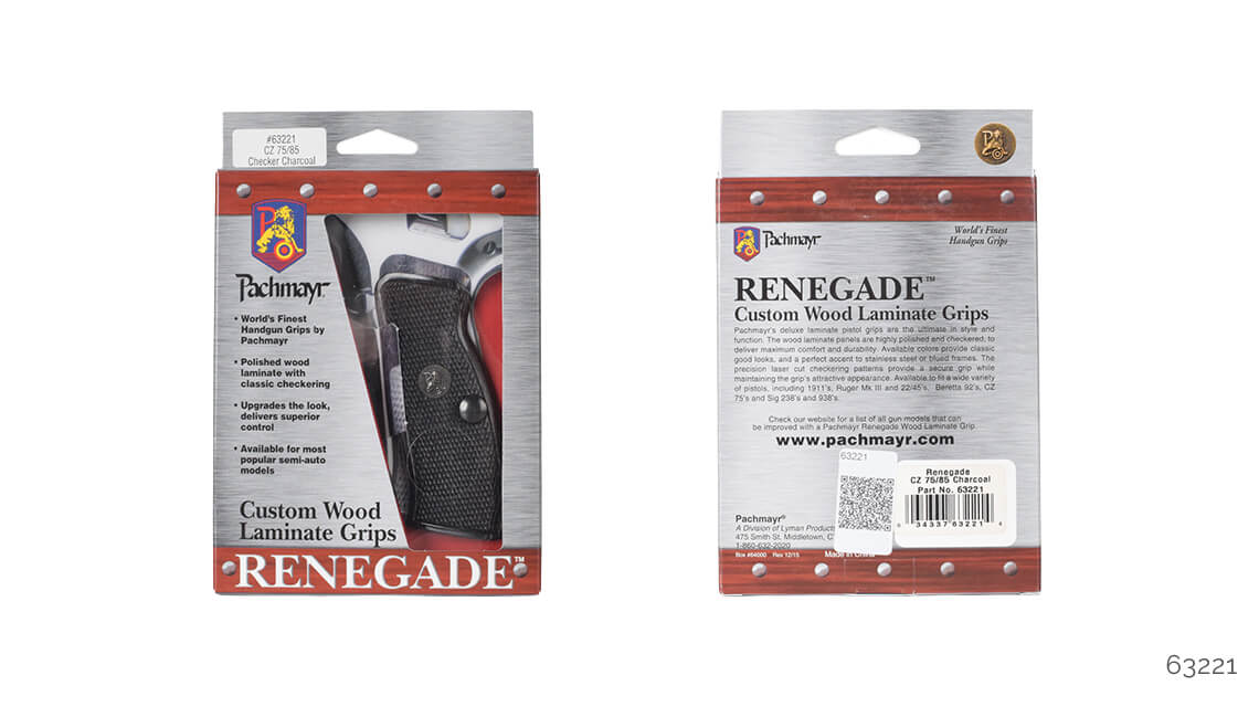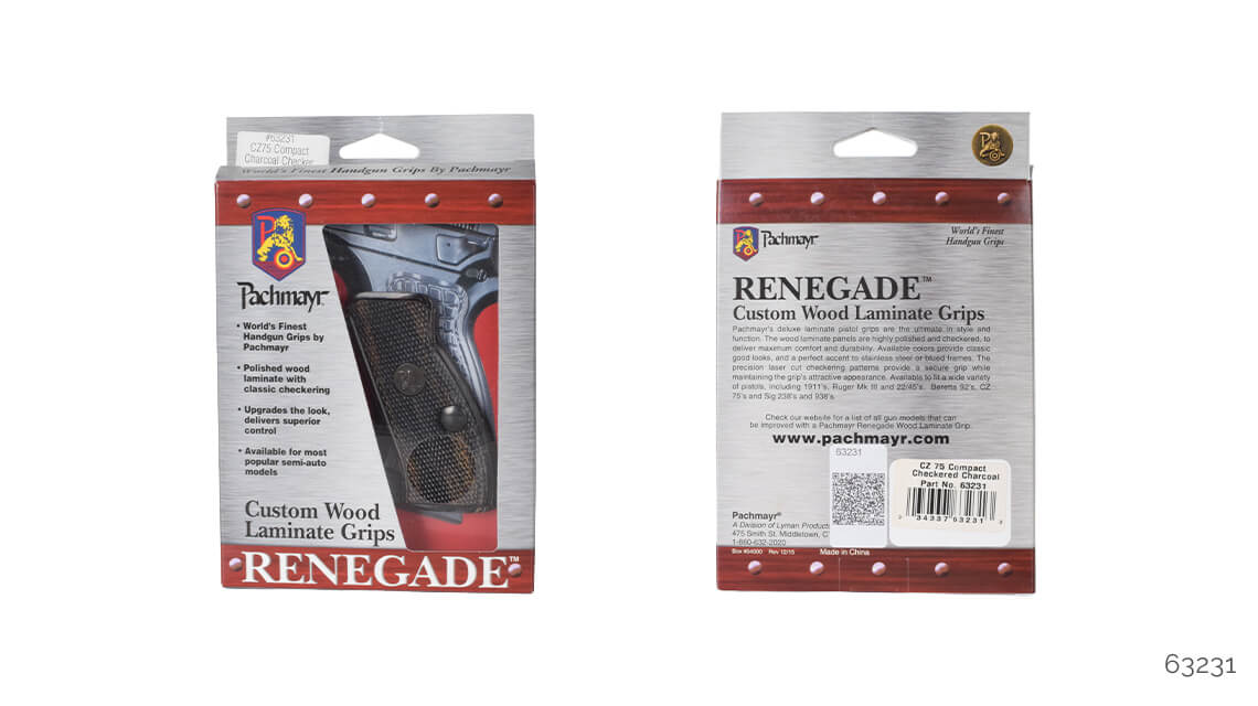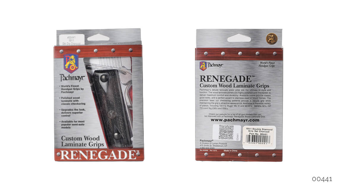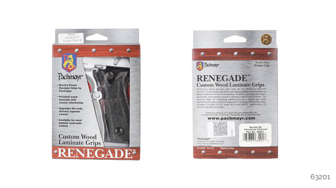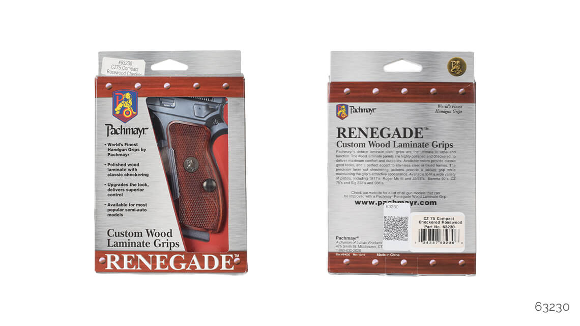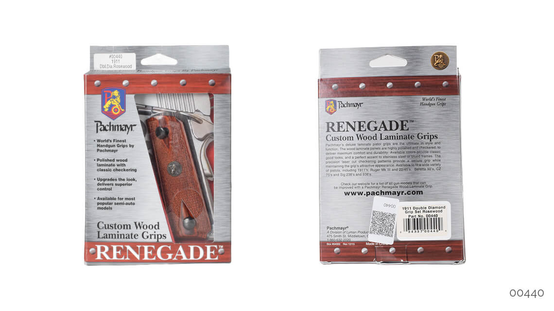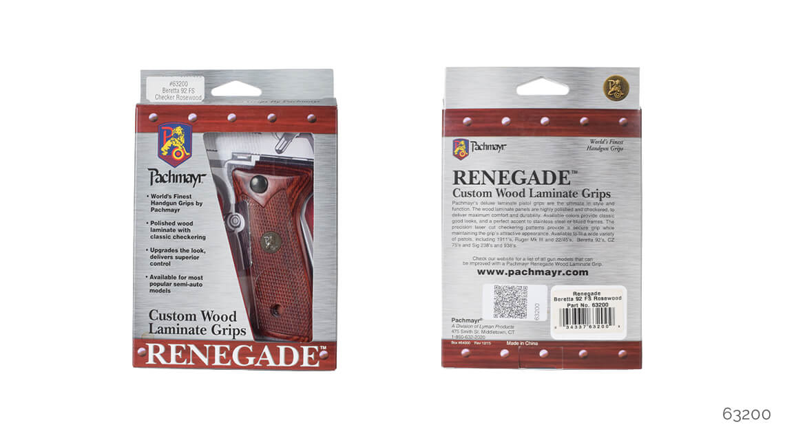 Pachmayr Renegade ahşap kabza kapakları, stil ve kullanım olarak üstün özellikler sunar. Ahşap lamine kapaklar parlatılmış ve kaymaması için CNC ile desen işlenmiştir. İki temel renk olarak gül ağacı ve kömür rengi vardır, bu renkler hem menevişli hem de beyaz krom silahlara yakışır. 1911, Beretta F92 ve CZ75 için modelleri mevcuttur.